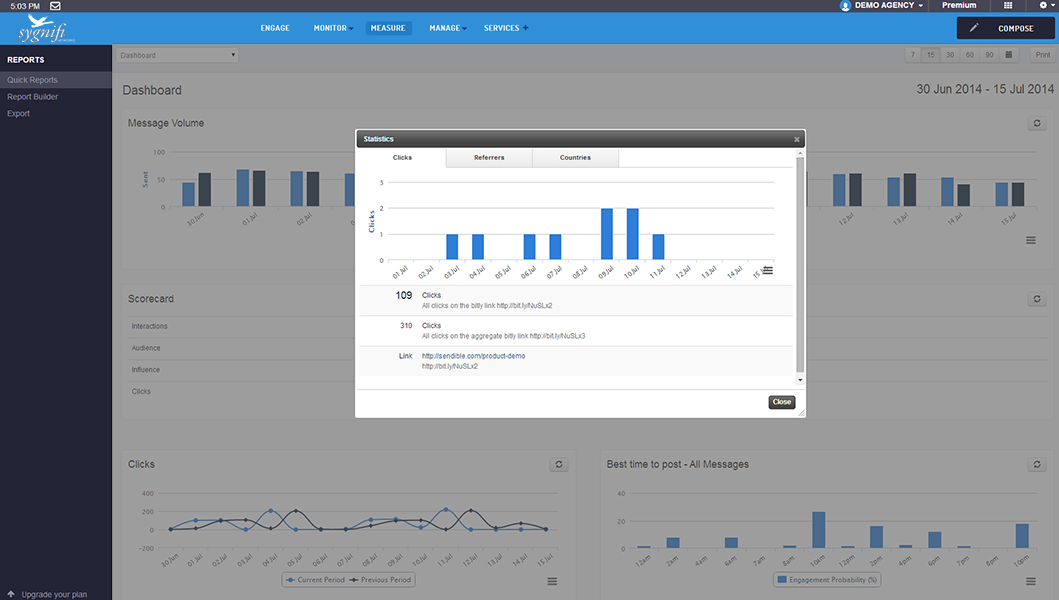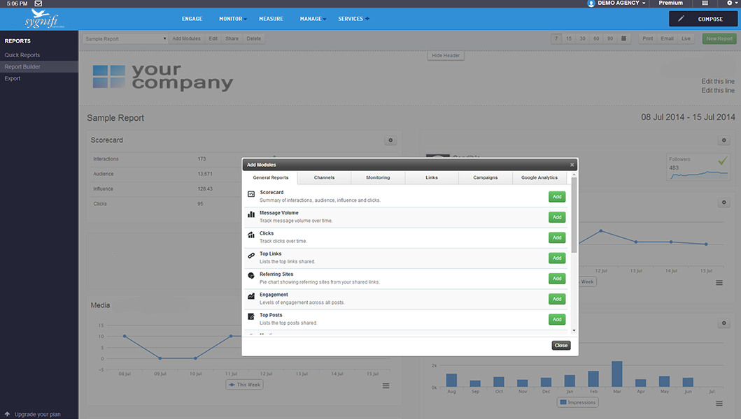SmartSocial makes it easy to build presentation-ready reports with detailed analytics. Use our report builder to create meaningful reports using a combination of over 200 modules.