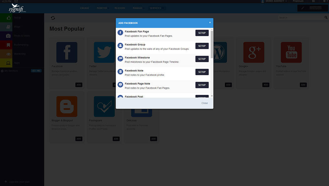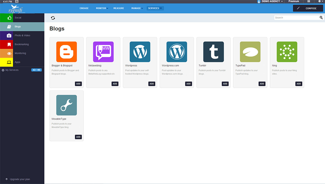 With so many integrations available in SmartSocial, you can rest assured knowing that all the social networks and blogging platforms your organization uses is available within the dashboard. Best of all, if you have a custom requirement for any integrations we don't have, just ask us and we'll add it for you.