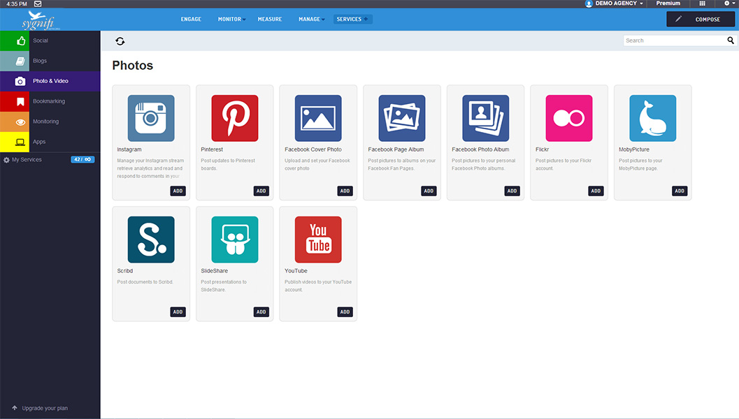 Connect up your Pinterest, Flickr and Instagram accounts to SmartSocial so that you can post photos, read and respond to comments and track analytics.