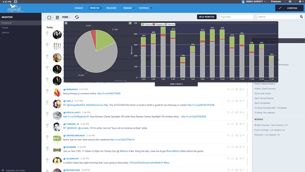 Monitor what's being said about your brand on blogs, news, social networks and in comments. Use SmartSocial's automatic sentiment analysis to highlight the mentions that need your urgent attention.