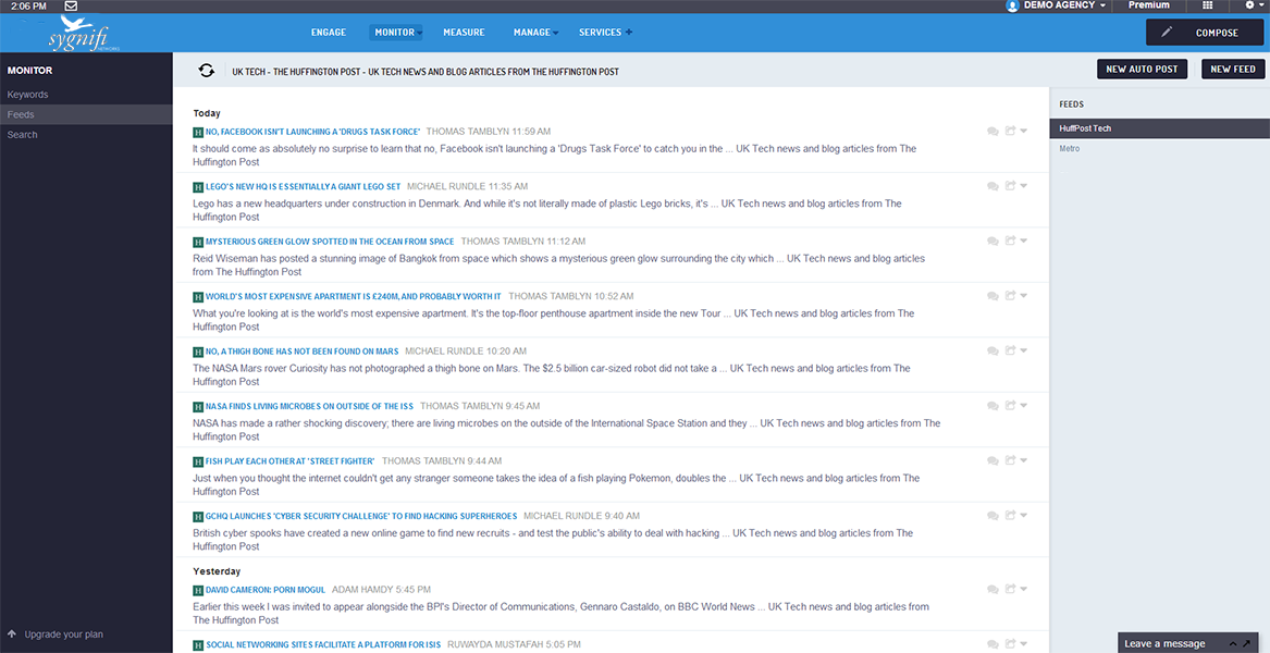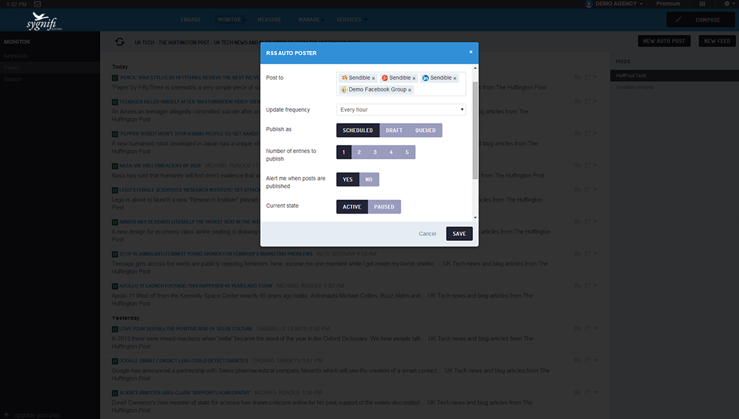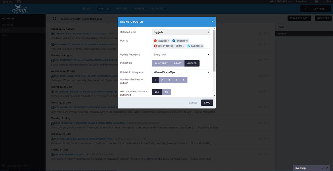 Use SmartSocial's RSS Auto Posting features to publish topical content to your social networks at regular intervals throughout the day. Automatically distribute new posts from your blog to your social channels.