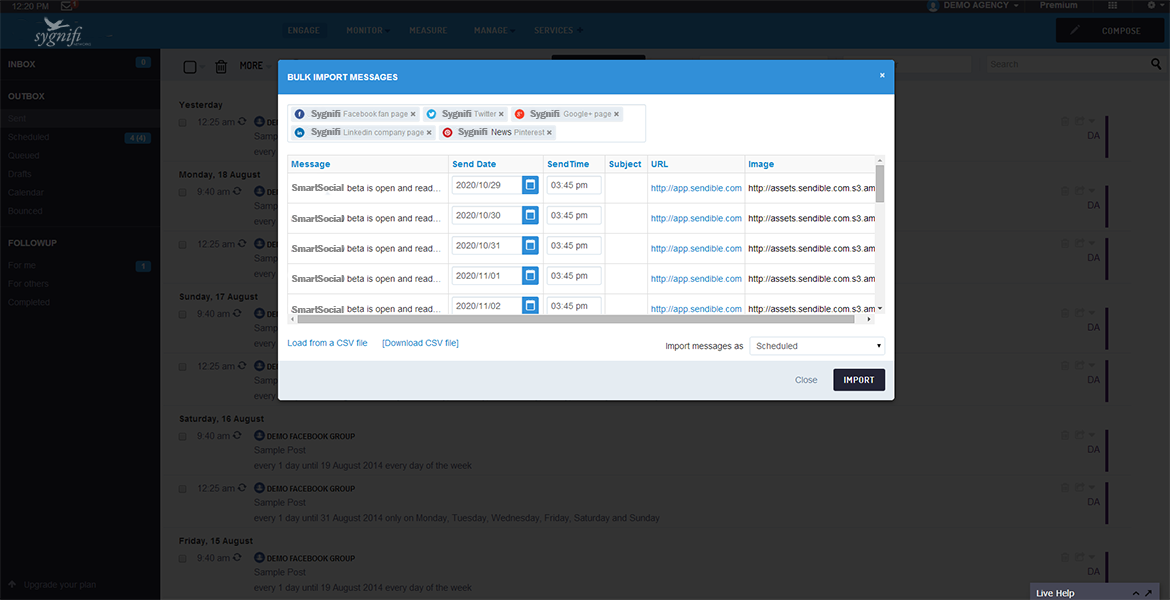 Import content from Excel, a CSV or any other external system to schedule multiple messages in bulk. Use our built-in grid to draft and schedule multiple messages for a campaign.