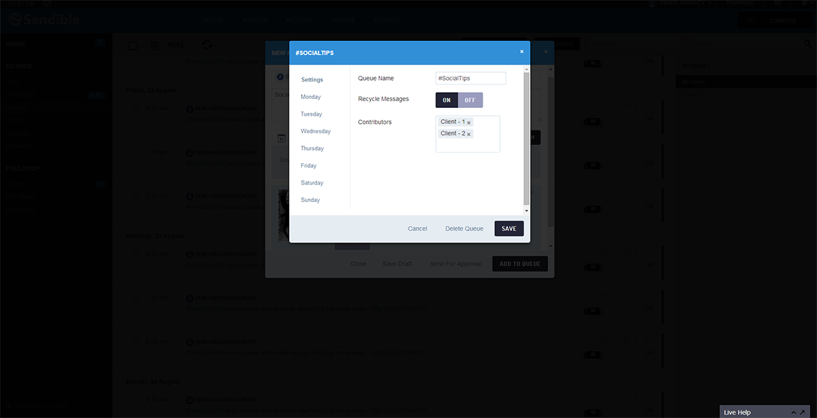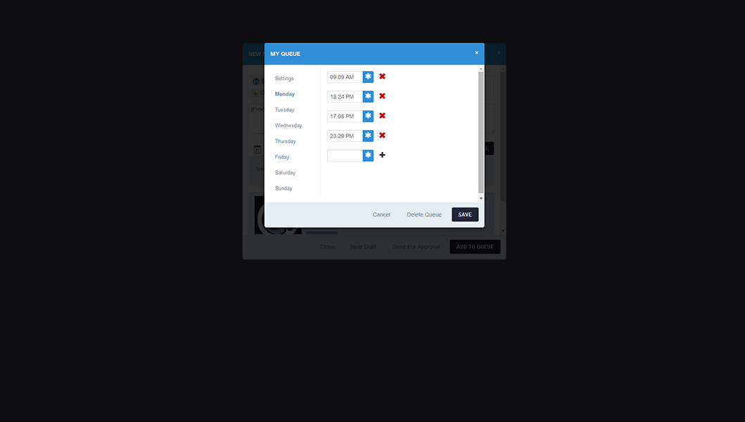 It's not always easy to know exactly when to schedule content to be shared on social media. That's why we've built Smart Queues that allow you to experiment with different publishing times for scheduling your content. SmartSocial will also learn and suggest the optimal times based on your audience activity.